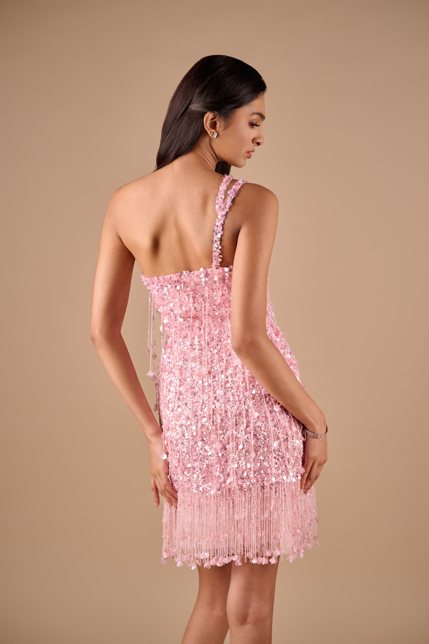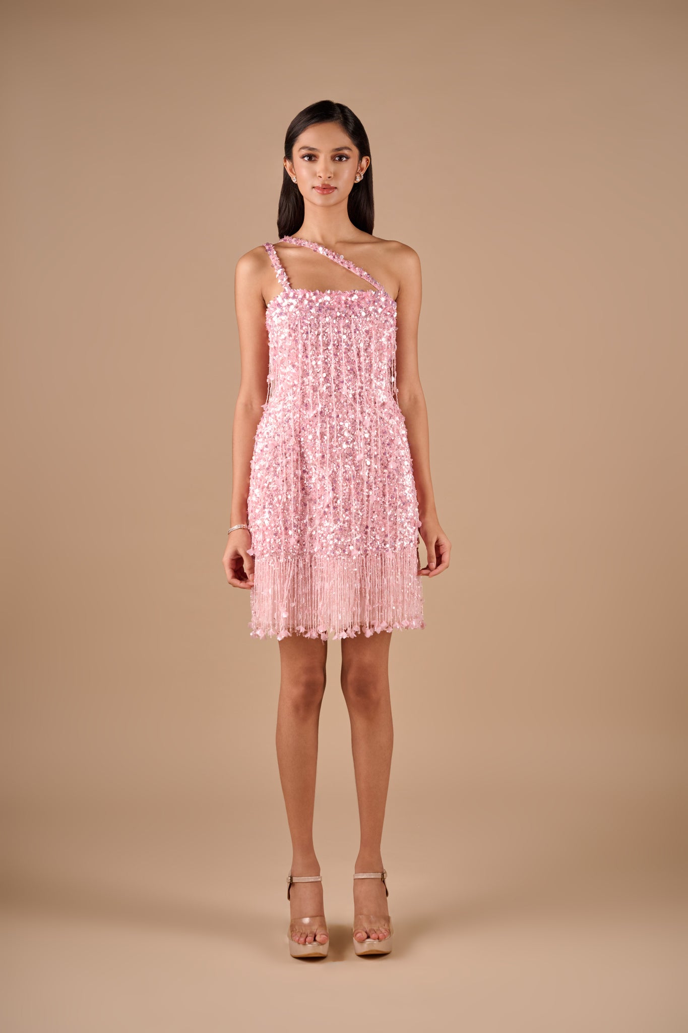 Playful yet poised, this pink fringe dress captures movement and charm in every detail. Featuring layered fringe embroidery and a modern asymmetric neckline, it offers a flirty, feminine silhouette that dances with grace. Perfect for cocktail evenings or celebrations that call for effortless glamour.