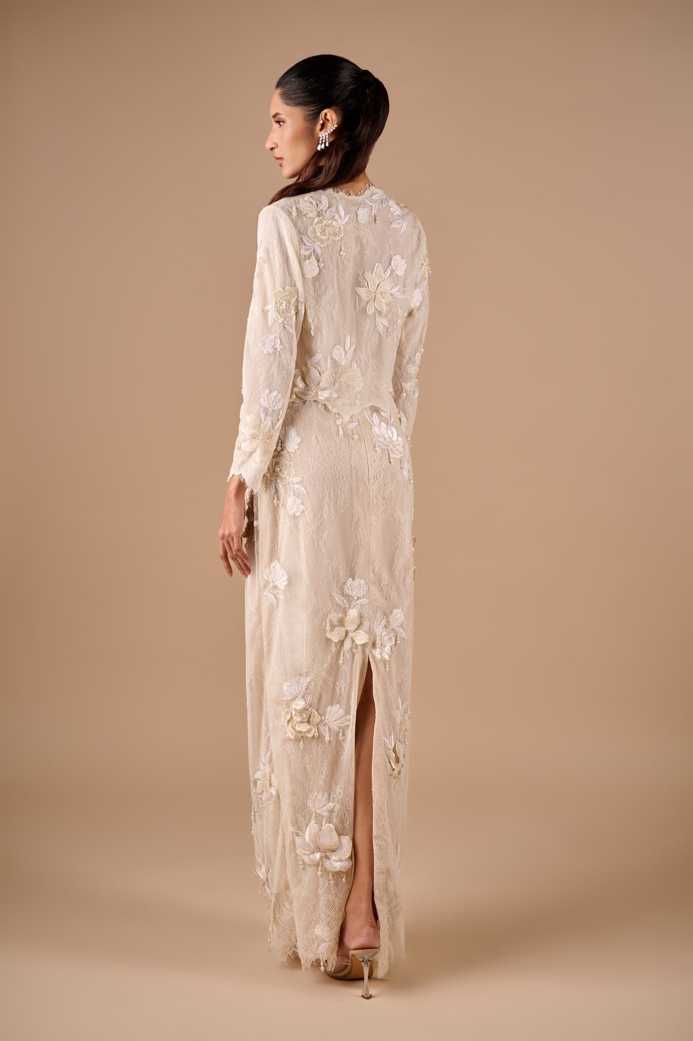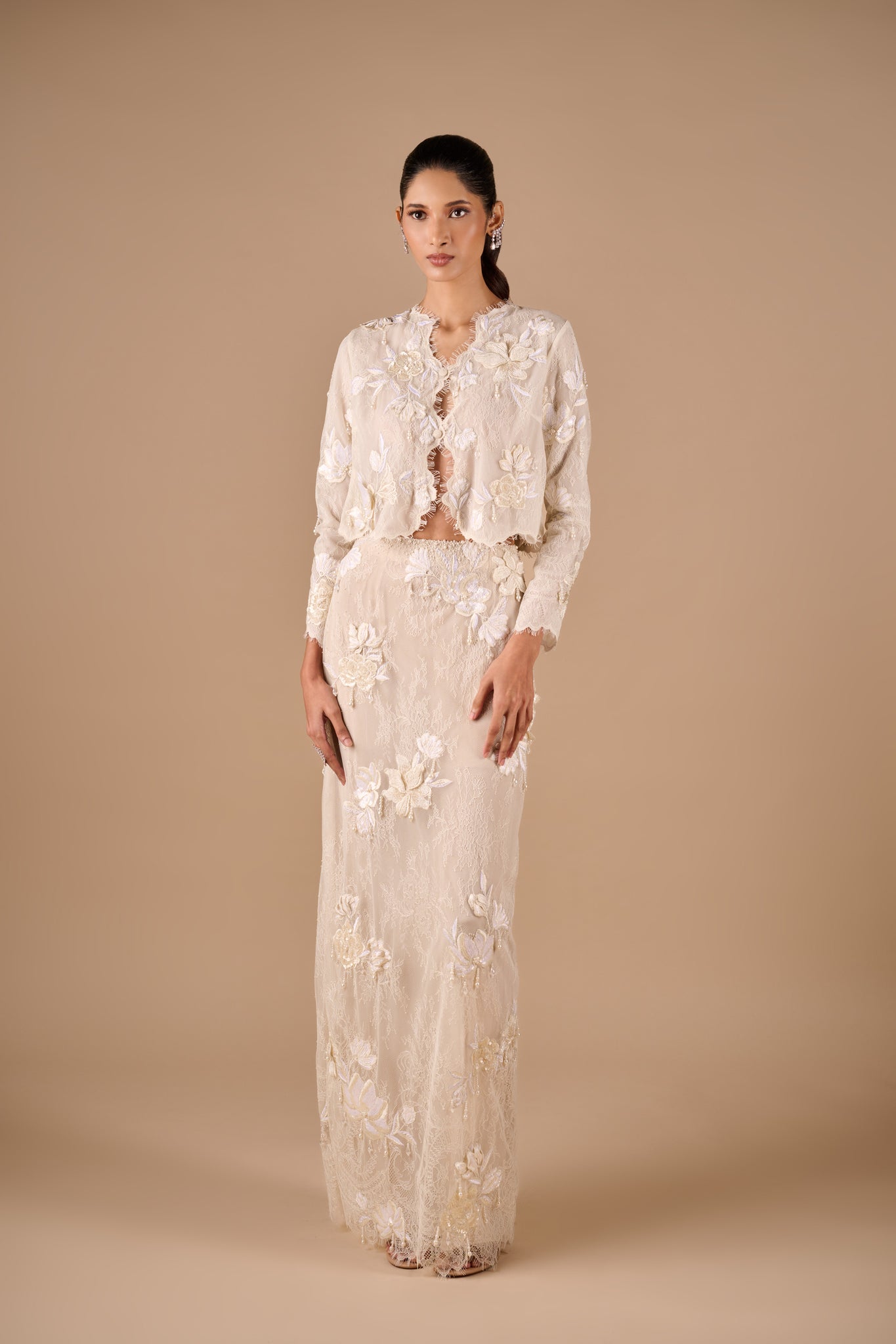 Paired with ethereal and intricately detailed, this floral lace maxi skirt features delicate 3D embroidery and soft fringe accents that add fluidity and charm to every step. The fitted silhouette flows into a graceful length, blending elegance with understated allure — perfect for refined soirées or statement ensembles.
