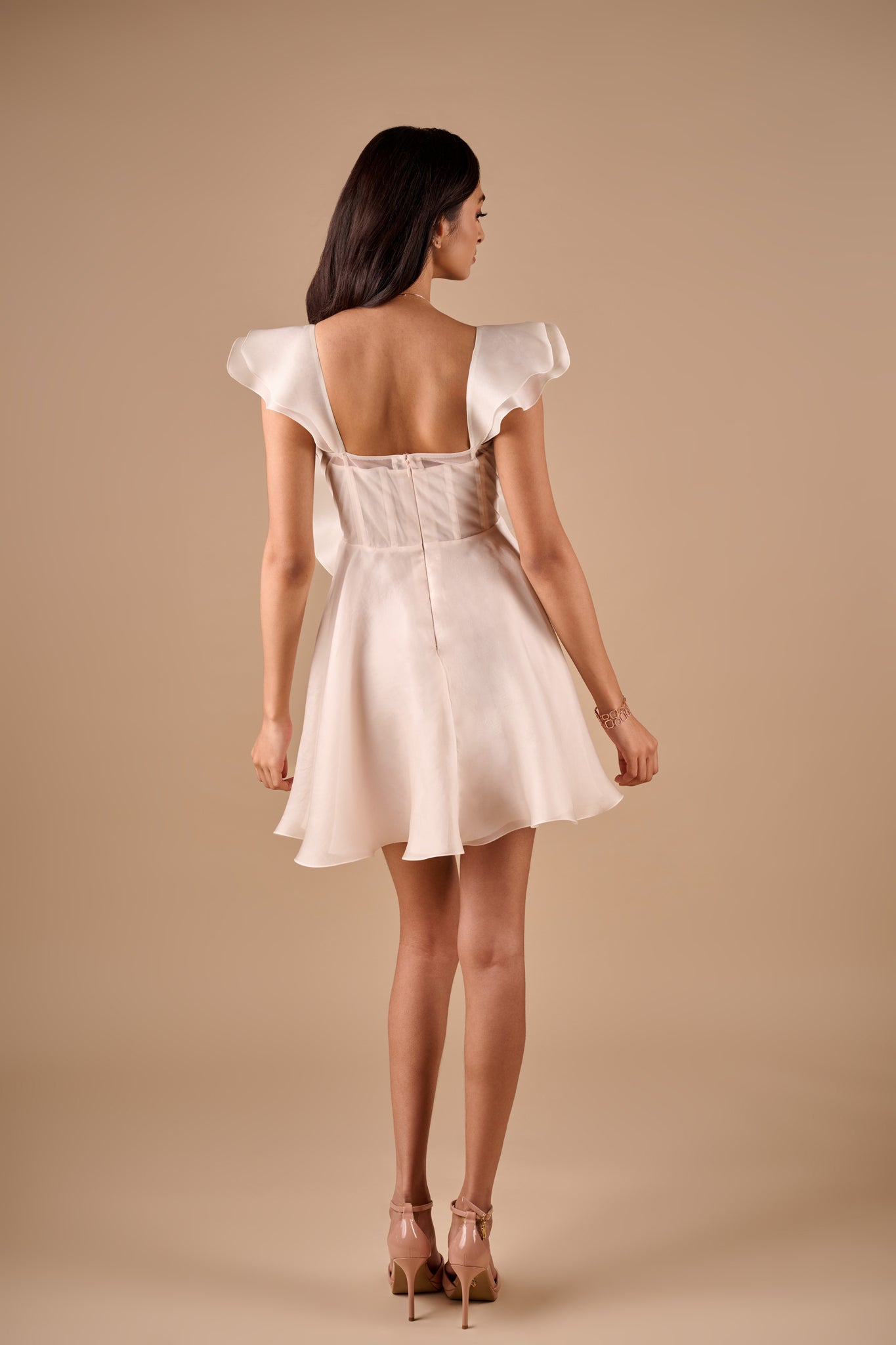 This organza ruffle dress exudes ethereal elegance and modern romance. Crafted from lightweight, airy organza, it features cascading ruffles that create a graceful sense of movement. The highlight of the design is the sculptural rose drape adorning the bodice — a statement detail that adds dimension and femininity. With delicate shoulder ties and a tiered, A-line silhouette, the dress flatters the figure while maintaining a soft, whimsical charm. Perfect for evening soirées, cocktail parties, or special celebrations, this piece captures timeless sophistication with a contemporary flair.
