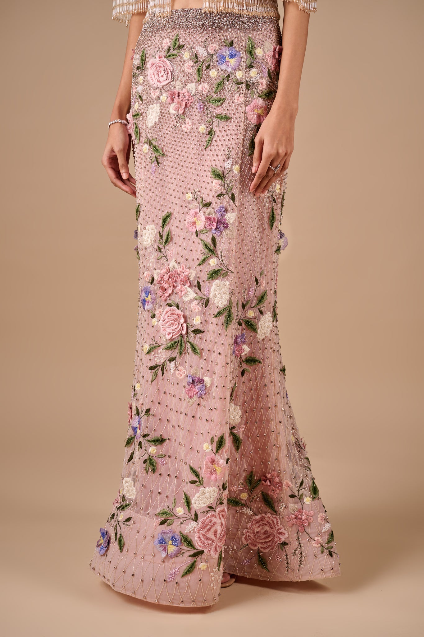Radiating modern glamour, this fishtail skirt set features intricate floral embroidery over a delicate crystal-embellished grid design. Paired with a cropped fringe jacket and a pleated bralette, the ensemble blends structure with fluid elegance. Crafted in a soft blush tone, it’s the perfect harmony of sparkle, texture, and timeless femininity.
