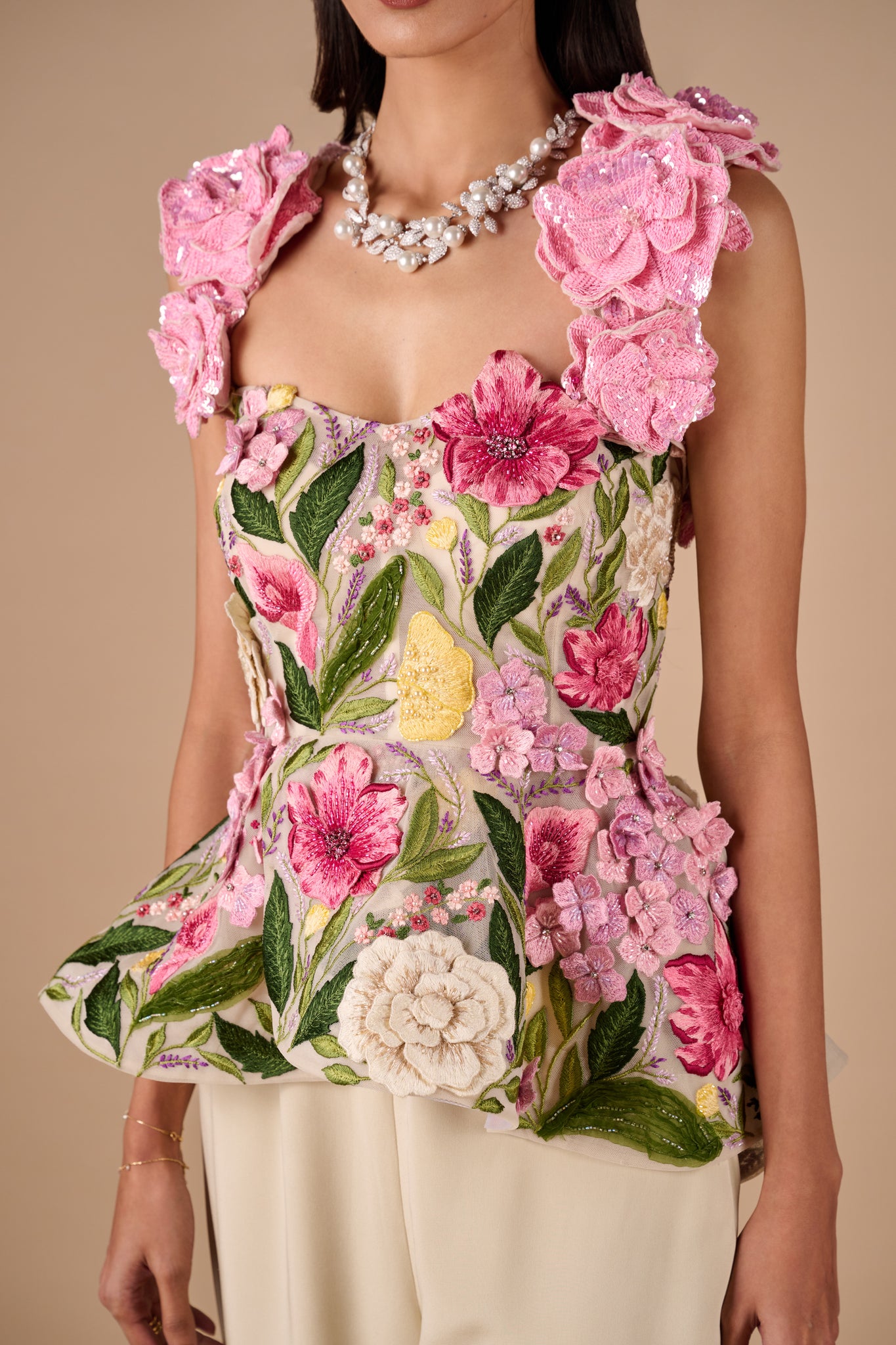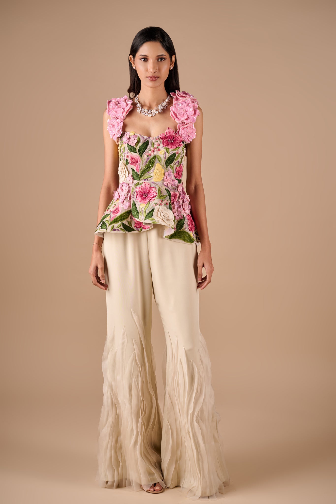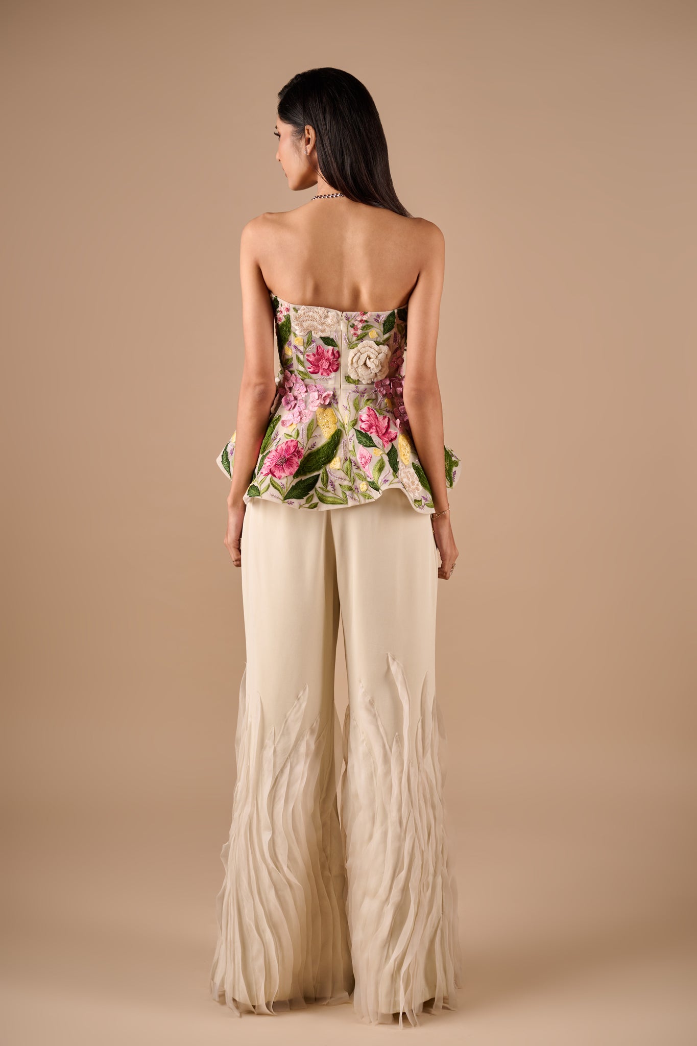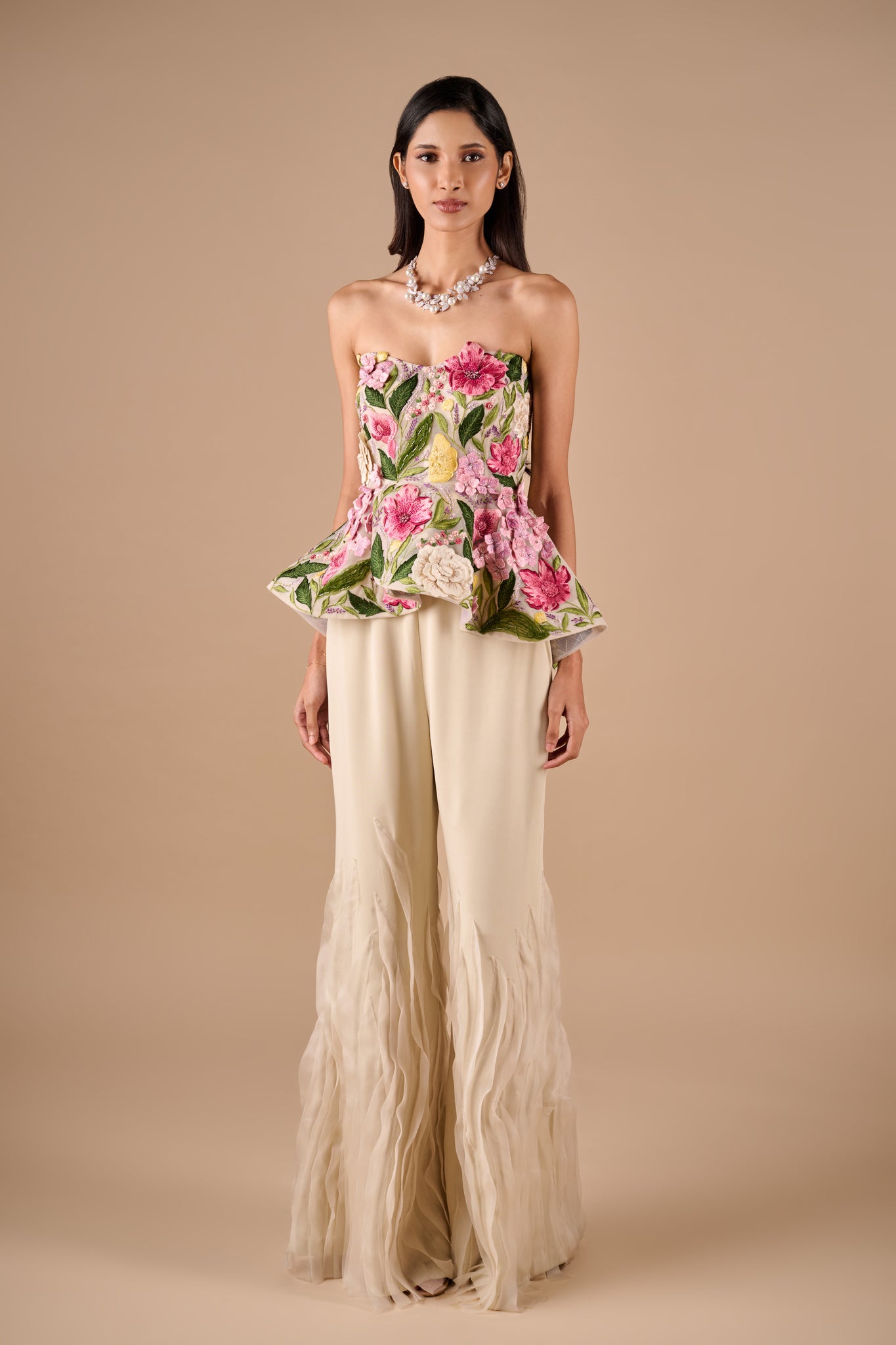 A celebration of color and craftsmanship, this embroidered peplum top features intricate floral embroidery in vibrant pink and green tones. The structured strapless silhouette and flared peplum hem create a flattering, feminine shape — blending modern elegance with timeless artistry. Perfect for pairing with flowing pants or statement skirts.
